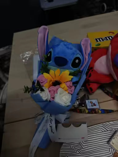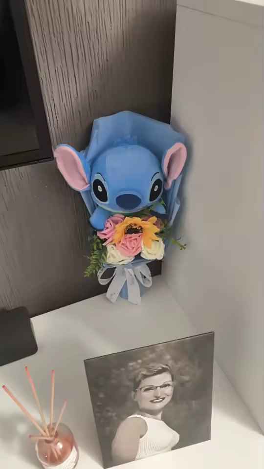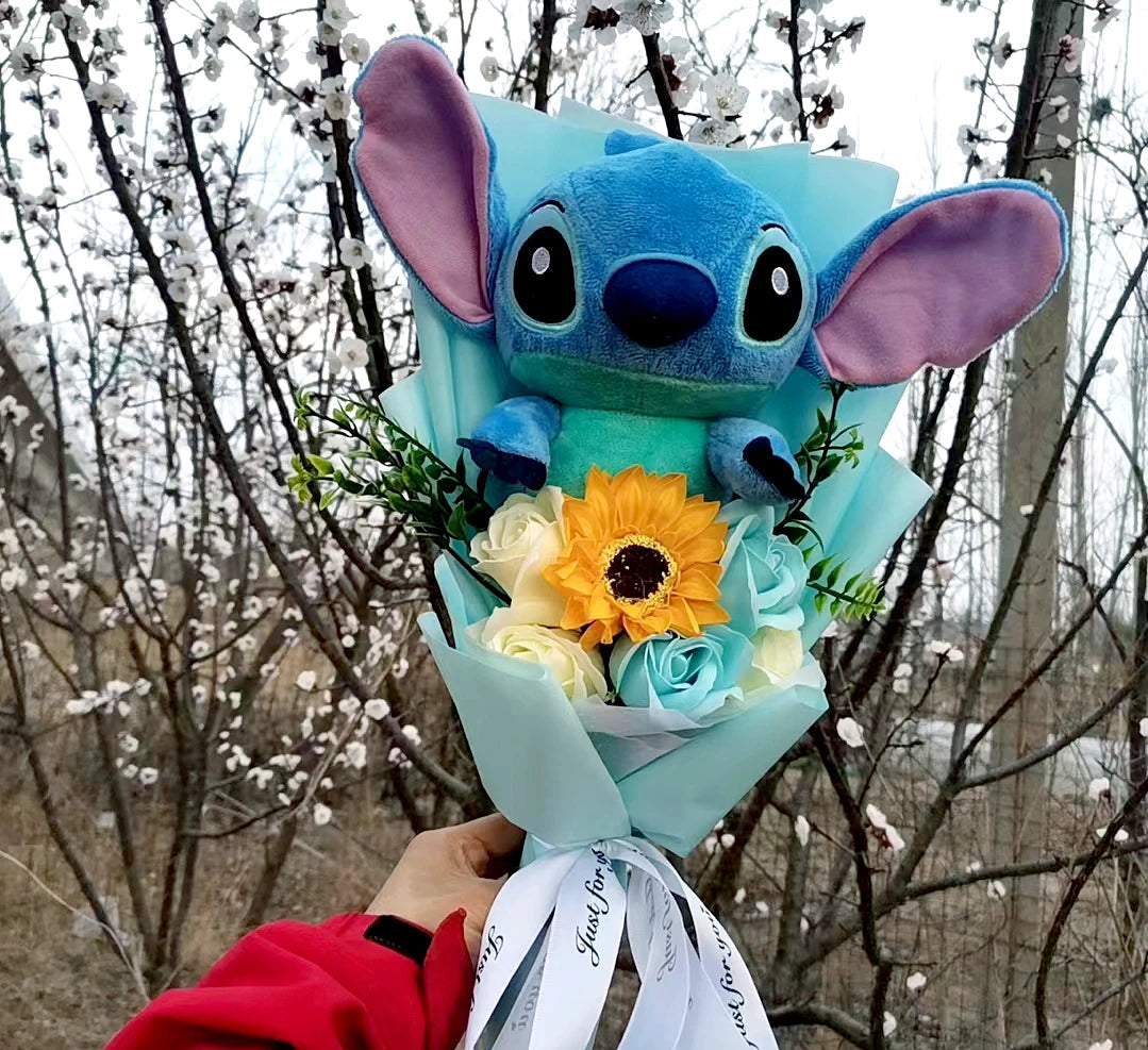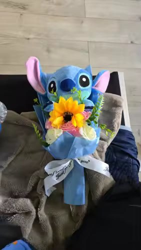 This adorable bouquet features a high-quality stuffed Stitch doll arranged with durable PVC roses and sunflowers. Unlike real flowers that wither, this keepsake gift combines the charm of a plush toy with the beauty of a floral arrangement, ensuring it lasts forever as a cherished memory.